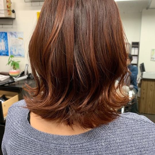 カラーは温かみのあるオレンジ系のお色に! アイロンまたはコテ巻きで外ハネのトップはミックスでコテ巻き仕上げしてます。 -